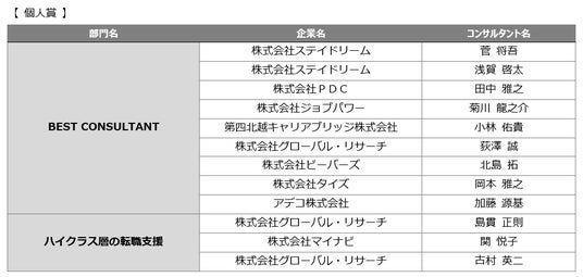 ・BEST CONSULTANT:転職支援数が優れており、転職希望者から高い満足度を得ているコンサルタントを選出