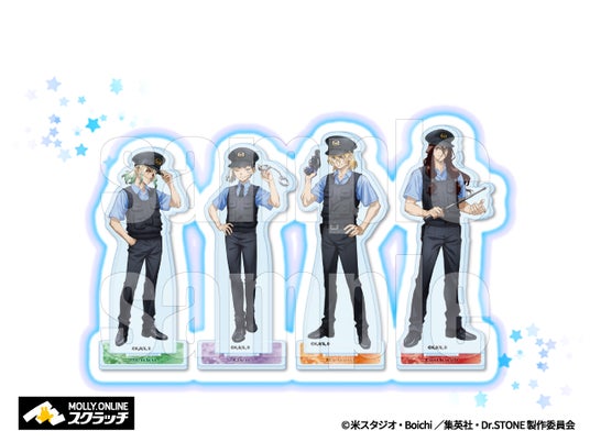 描き下ろしイラストの警察官衣装に身を包んだ「石神千空」、「あさぎりゲン」、「七海龍水」、「獅子王 司」のアクリルスタンド。