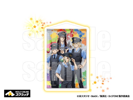 描き下ろしイラストの警察官衣装に身を包んだ「石神千空」、「あさぎりゲン」、「七海龍水」、「獅子王 司」のタペストリー。
