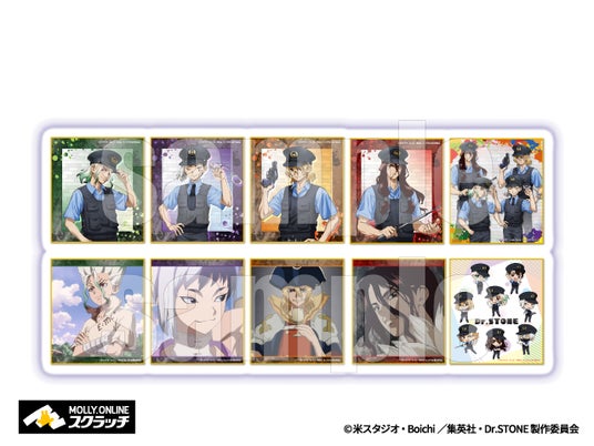石器時代から現代文明まで、科学史200万年を駆け上がる!前代未聞のクラフトアドベンチャーTVアニメ『Dr.STONE』の限定グッズが、モーリーオンラインスクラッチに登場します。「TVアニメ『Dr.STONE』×MOLLY.ONLINEスクラッチ」限定グッズには、警察官衣装に身を包んだ石神千空、あさぎりゲン、七海龍水、獅子王 司、クロム、西園寺羽京、上井 陽、氷月の新規描き下ろし&新規描き起こしイラストや作中シーンを採用。全5等賞35アイテムが当たります。