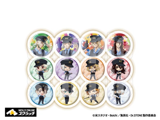 描き下ろしイラスト&描き起こしイラストの警察官衣装に身を包んだ「石神千空」、「あさぎりゲン」、「七海龍水」、「獅子王 司」、「クロム」、「西園寺羽京」、「上井 陽」、「氷月」が描かれたグリッター加工の缶バッジ。