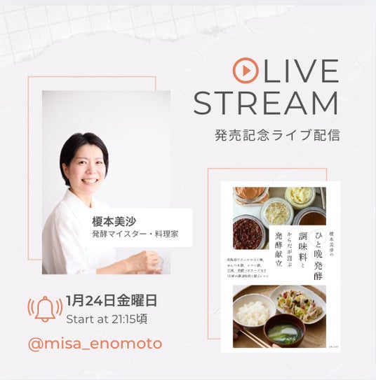 発売を記念して、ライブ配信を行います。当日は著者の榎本美沙さんが書籍の中から、ひと晩発酵調味料の作り方と発酵調味料を活用したレシピをご紹介します。
