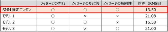 メッセージのカテゴリを考慮せず、メッセージの指向性を考慮するモデル3の評価結果は、カテゴリおよび指向性の両方を考慮しないモデル1とほぼ同じ精度にとどまりました。「誰から誰へ」という指向性の情報だけでは、SMMの推定精度は向上しないことが確認できました。