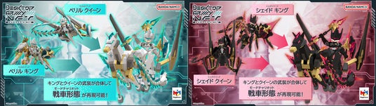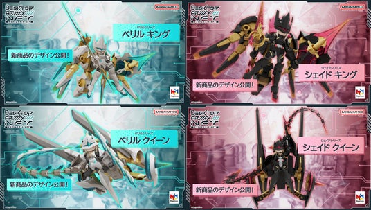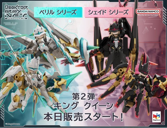 シリーズ第2弾となる「ベリル」「シェイド」の大型武装として、「ベリル キング」「ベリル クイーン」「シェイド キング」「シェイド クイーン」が登場となります。それぞれ武装パーツの組み合わせによって、キングでは「軍馬形態」、クイーンでは「玉座形態」に組み立てが可能となります。