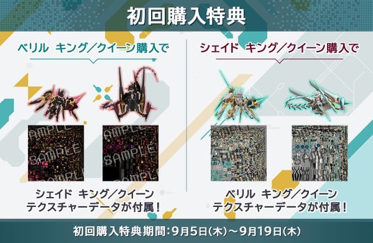 また、本日9月5日(木)から9月19日(木)の期間に「ベリル キング/クイーン」を購入いただくと「シェイド キング/クイーン」のテクスチャーデータが、「シェイド キング/クイーン」を購入いただくと「ベリル キング/クイーン」のテクスチャーデータが付属いたします。ぜひこの期間にお買い求めください。