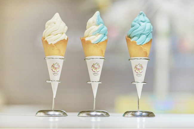 『NAKED FLOWERS FOR YOU』らしく、バター風味のサブレ生地を使用し花束をイメージした形状のコーンに、ソフトクリームを花びら形に盛る『ブーケソフト』。コーンの部分は「ブーケサブレ」と呼ばれ、クッキーの一種として人気も高く、ソフトクリームとの相性も良いバター風味とマイルドな甘みが特徴のサブレ生地をオーブンで丁寧に焼き上げ、コーン形状に巻いた焼き菓子。ソフトクリームの味は3種類。北海道ならではの風土が育んだ乳脂肪をたっぷりと8.0%含んだ「北海道ソフトクリーム」をベースに、ミルク・フラワーフレーバー・ミックス(ミルク×フラワーフレーバー)で展開。フラワーフレーバーは、「北海道ソフトクリーム」にFLOWER(花)のフレーバーシロップで色づけたもの。季節でフレーバーを変えていく予定で、夏は見た目も涼しくて珍しい“青バラ”です。