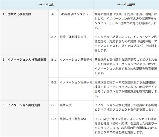 OKIは、一般社団法人 Japan Innovation Network(所在:東京都港区、代表理事:紺野 登、以下:JIN)と連携しながら、OKIのIMS「Yume Pro(注2)」を開始しました。その後、経営層主導のもと活動を全社規模に拡大し、2025年7月には英国規格協会(BSI)よりISO 56001に基づく「BSI Kitemark(TM)」認証を国内で初めて取得しました。「IMS支援サービス」では、OKIが培った実績を体系化し、ISO 56001認証取得やイノベーション活動を推進したい企業・組織の課題や要望に応じたコンサル、教育、実践支援を行います。たとえば、イノベーションの考え方やアイデア創出方法を修得するには、IMS/デザイン思考によるコンセプト構築を体系的に学習するイノベーション基礎研修、実践研修を行います。さらに学習だけではなく、新規ビジネスの種をお客様との共創活動を通じて具体化する実践支援、共創支援(共創ワークショップ)を行います。さらに、JINのIMSに関する知見・戦略的方向性づくりとOKIの実践力を融合し、協働した包括的プログラムの提供も行います。