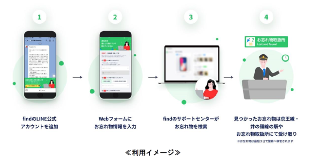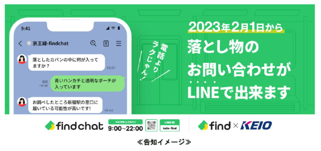 京王電鉄株式会社(本社:東京都多摩市、取締役社長:都村 智史、以下、「京王電鉄」)と、ReGACY Innovation Group株式会社(本社:東京都千代田区、代表取締役:成瀬 功一、以下、「ReGACY」)は、2022年7月より開始した、スタートアップ企業をはじめとした外部企業との共創によるオープンイノベーションの実現を目指す「KEIO OPEN INNOVATION PROGRAM」の採択企業である株式会社find(本社:東京都中央区、代表取締役:高島 彬、以下、「find」)と共同で、2023年2月1日(水)から「落とし物クラウドfind」による京王電鉄のお忘れ物取扱業務における実証実験を開始します。