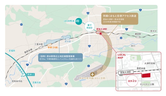 JR豊肥本線「肥後大津駅」より徒歩2分、半導体関連産業が集積するセミコンテクノパークまで車で約8分(約3.5km)という、通勤やビジネスにおいて利便性の高い場所に位置しております。