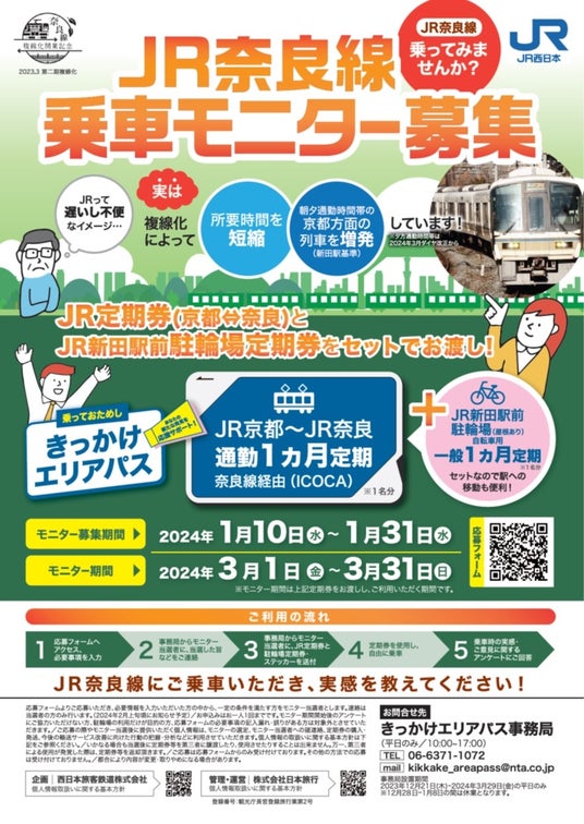 京都駅と奈良駅を結ぶ奈良線については、第2期複線化により2023年3月に京都駅から城陽駅間が完全複線化となり、「所要時間の短縮」や「朝夕通勤時間帯の増発」※を行っています。この度、複線化の効果を体感いただくとともに、更なるサービス改善に繋げることを目的にJRと駅駐輪場の定期券をお渡しし、奈良線に乗車、アンケートにご回答いただく「奈良線乗車モニター」を募集します。
