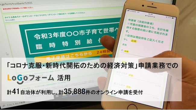株式会社トラストバンク(本社:東京都渋谷区、代表取締役:川村憲一、以下「トラストバンク」)は、全国428自治体*が利用し、IT知識がなくても職員が簡単にフォームを構築できる行政手続きデジタル化ツール「LoGoフォーム」において、「令和3年度 子育て世帯への臨時特別給付金」と「住民税非課税世帯等に対する臨時特別給付金」などのオンライン申請サービスを開始しています。2月3日時点で静岡県三島市、静岡県島田市、奈良県橿原市、愛媛県今治市などの41自治体がLoGoフォームを活用しており、静岡県三島市では、申請全体の93.3%がLoGoフォームでのオンライン申請となっています。