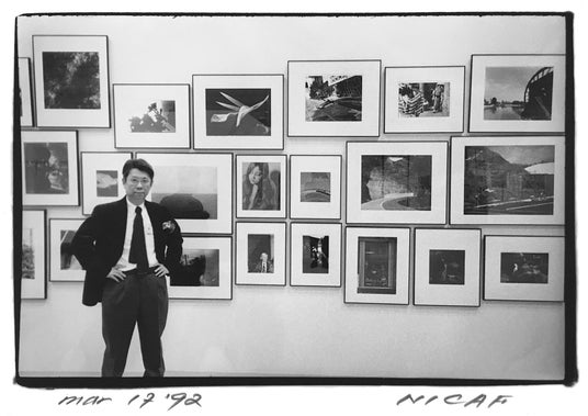 アートフェアNICAFにて、出展ブースの前に立つ石原悦郎。1992年3月17日 (C) Estate of Shigeo Anzaï