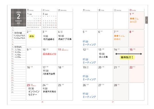 □年間スケジュールメモ(見開き)(2026年)