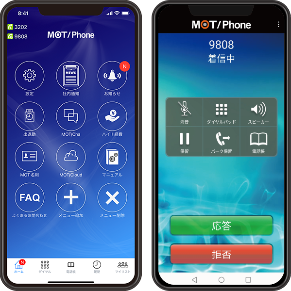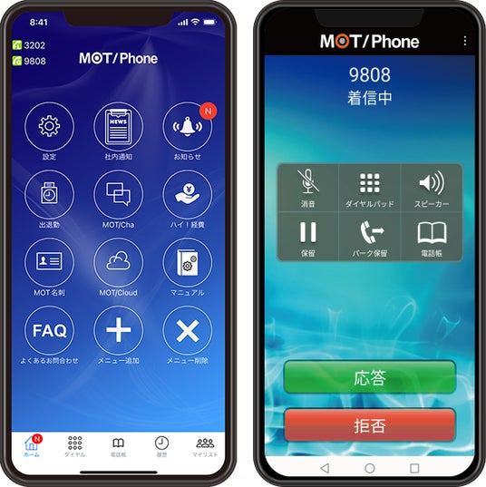 MOT/Phoneは、オフィスの固定電話をスマートフォンやPCで利用できるクラウド電話「MOT/TEL」や、IP電話システム「MOT/PBX」が利用できるスマートフォンの専用アプリです。