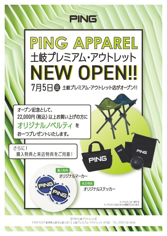 オープン記念として店舗来場者には先着にてオリジナルステッカーを、購入特典としてオリジナルマーカーをプレゼントいたします。またPING APPARELを22,000円(税込)以上お買い上げの方には先着順でPINGオリジナルアイテムをプレゼントいたします。