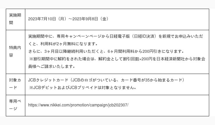 株式会社ジェーシービー (本社:東京都港区、代表取締役兼執行役員社長:二重 孝好、以下:JCB)は、2023年7月10日(月)から2023年9月8日(金)まで、利用料が2ヶ月無料となる「JCBカードで新規に日経電子版(日経ID決済)を申込の方に特別なキャンペーン」を実施します。