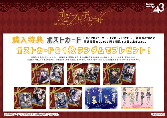 『恋とプロデューサー~EVOL×LOVE~』新商品を含めて関連商品を1会計2,200円(税込)お買い上げごとに、購入特典としてポストカード(全7種)を1枚プレゼント。