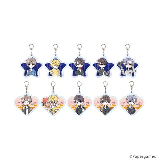 星やハートのダイカットデザインが目を惹く、縦横最大6.5cmのアクリルキーホルダー。