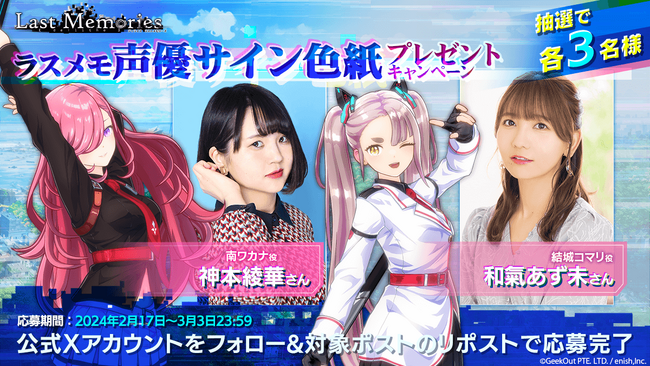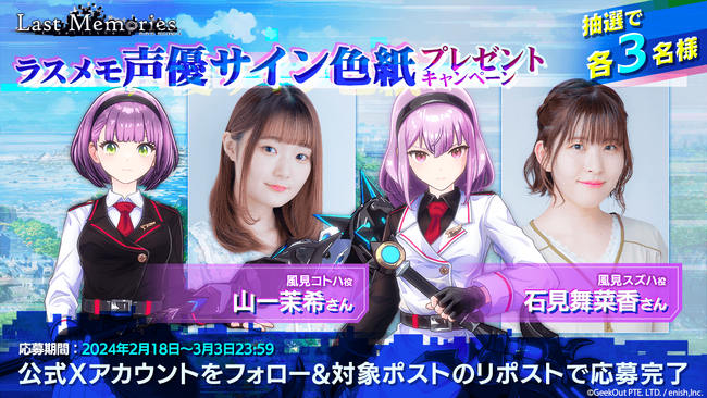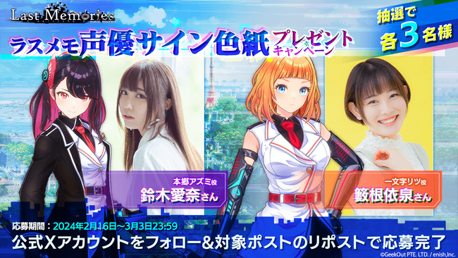 株式会社enish(本社:東京都港区、代表取締役社長:安徳孝平、以下enish)は、2024年2月14日(水)、累計ダウンロード数900万突破のスマートフォン向けドラマチック共闘オンラインRPG『De:Lithe~忘却の真王と盟約の天使~』をベースとした、モバイルゲームクオリティのブロックチェーンゲーム『De:Lithe Last Memories(ディライズ ラストメモリーズ)』で第6部隊の声優を務める芹澤優さん、田中しおりさんのサイン色紙が手に入るキャンペーンを開催いたしました。