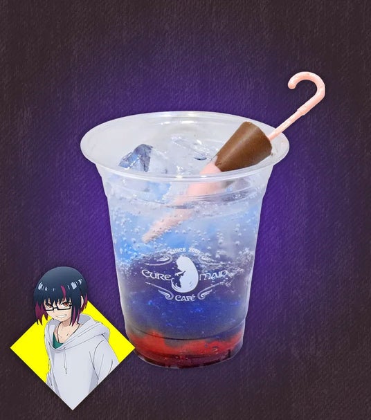 シズクの髪色のような紫と青と赤のゼリーの入ったドリンク。透明のサイダーを注ぎ、傘チョコでトモコとのエピソードの雨を表現。