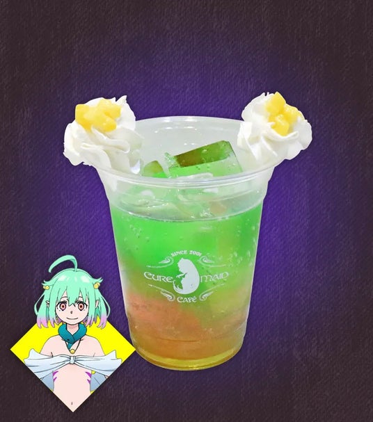 よるむんをイメージしたピンクとグリーンのドリンク。ホイップにマンゴーをのせて髪飾りを表現。炭酸の泡が人魚の彼女らしく弾けます。ピーチとメロンソーダの相性もばっちりな一杯。