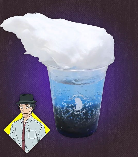 異界のような濃い青のグラデーションドリンクに煙のようなわたがしを添えました。わたがしは異界色のドリンクにふれると消えてしまいますのでご注意下さい。それもまた異界を表しているのかもしれません……。