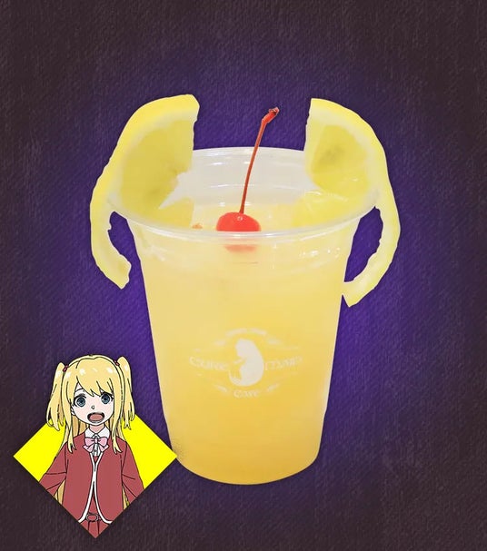 のどかの髪色のリンゴジュースに、ツインテールのようにレモンを飾りました。さくらんぼをのせて、アイドルを目指す彼女の音楽を表現♪