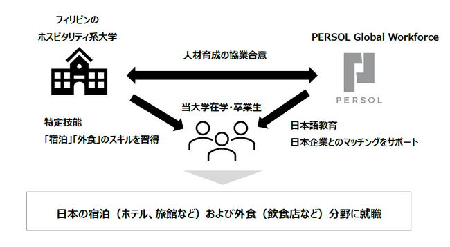 このような課題を受け、PERSOL Global Workforceは、今後の宿泊、外食分野の外国人材確保に向けて、フィリピンのホスピタリティ系大学※5と共に人材育成・日本就職に関するスキームを構築します。