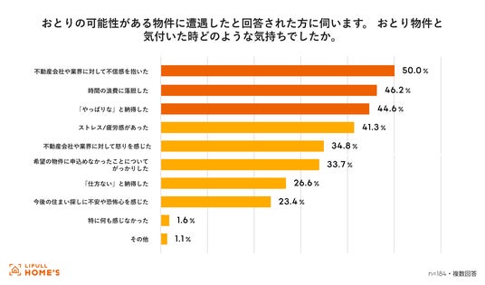 おとり物件に気づいた際の気持ちとしては、「希望の住まいに申し込めなかった」という結果そのものよりも、「不動産会社や業界に対して不信感を抱いた(50.0%)」「やっぱりなと納得した(44.6%)」といった、業界全体に対する不信感を示す回答が多く見られました。単なる機会損失にとどまらず、住まい探しへの信頼感そのものが損なわれていることがうかがえます。