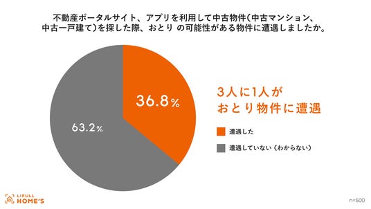 過去1年間に不動産ポータルサイト・アプリを使用して中古物件の購入を検討した方500名に、「おとりの可能性がある物件に遭遇しましたか」と質問したところ、「申込できない物件(おとり物件)」に遭遇した人は36.8%となりました。およそ3人に1人が「おとり物件」に遭遇していることになります。