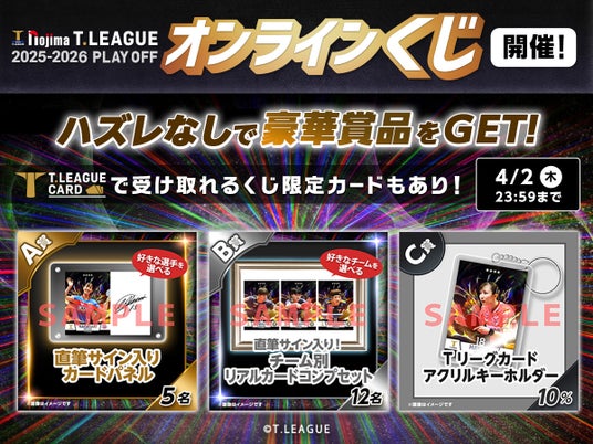 プロスポーツチームやリーグ向けのデジタルトレーディングカードやチケットリセールサービスを開発・運営する株式会社VOLZ(本社:東京都渋谷区、代表取締役:池田宗多朗、以下VOLZ)は、一般社団法人Tリーグの公式デジタルトレーディングカードサービス「T.LEAGUE OFFICIAL DIGITAL CARD(以下Tリーグカード)」において、ノジマTリーグ 2025-2026シーズンプレーオフの開催を記念した、様々な特別企画を実施することをお知らせいたします。