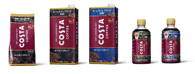 左から「コスタコーヒー ホームカフェ ブレンド 粉」(150g フレキシブルパック)、「コスタコーヒー ホームカフェ ブラック 無糖・加糖」(1000ml 紙パック)、「コスタコーヒー ホーム カフェ コーヒーベース ノンスイート・甘さ控えめ」(340ml PET)