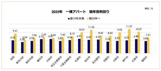 築年数による利回りの変化を見ると、一棟マンションは他の種別に比べて築古による利回り上昇幅(価格下落幅)が全体的に小さいのが特徴です。東京23区ではその差が1.12ポイント(4.46% vs 5.58%)と極めて小さく、資産価値が保たれています。また、地方都市においてもその乖離は限定的で、最も差の大きい仙台市でも3.70ポイント(5.48% vs 9.18%)に留まっており、全国的に築年数が経過しても利回りが低く抑えられ、価格が維持されやすい市況となっています。