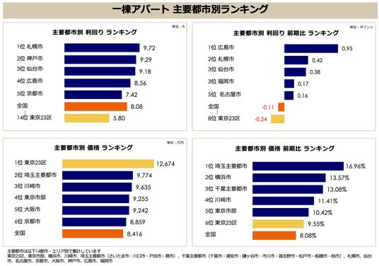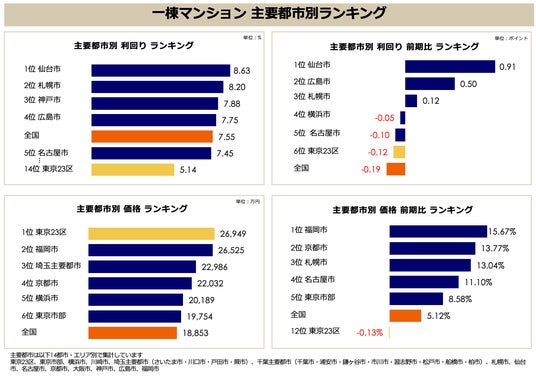 利回りは地方都市が高水準を維持しており、1位 札幌市(9.72%)、2位 神戸市(9.29%)、3位 仙台市(9.18%)と、上位3都市では9%台の高利回りが確認できます。