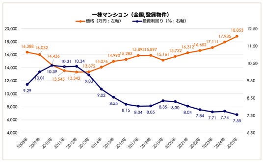 2025年の全国一棟マンション価格は1億8,853万円となり、前年比+5.12%(1億7,935万円)の上昇を記録しました。2012年の底値(1億3,342万円)と比較すると約1.4倍の水準まで上昇しており、緩やかながらも着実な価格上昇トレンドが継続しています。利回りは7.55%(前年比-0.19ポイント)へ低下し、2008年以降の集計で過去最低水準を更新しました。