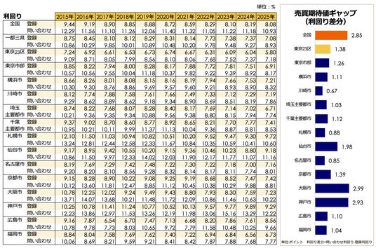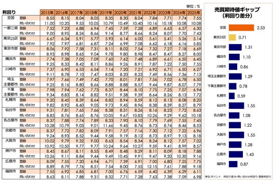 利回りについては、仙台市(8.63%)、札幌市(8.20%)、神戸市(7.88%)などが8%前後~後半の水準を示しており、価格上昇が続く中でも地方都市では比較的高い収益性が確保されています。