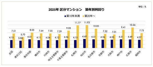 築年数による利回りの変化を見ると、地域ごとの資産性の違いが鮮明です。東京23区では、築10年未満(3.84%)と築20年以降(5.70%)の差が1.86ポイントに留まり、築古になっても利回りが低く抑えられ、資産価値が維持されやすい傾向が見られます。対照的に札幌市ではその差が7.62ポイント(4.15% vs 11.77%)と大きく開いており、築年経過に伴う価格下落圧力が強い市場構造となっています。