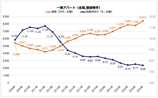 2025年の全国一棟アパート価格は8,416万円となり、前年比で8.08%上昇しました。区分マンション(+15%超)ほどの急騰ではないものの、2012年の底値(4,211万円)からは約2.0倍の水準まで堅調に拡大しています。利回りは8.08%(前年比-0.11ポイント)となり、依然として低下トレンドにありますが、区分マンションや一棟マンションと比較すると8%台という比較的高い水準を維持しています。