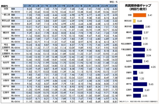 区分マンション 一都三県・主要都市別 売買期待値ギャップ推移(利回り)