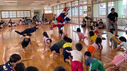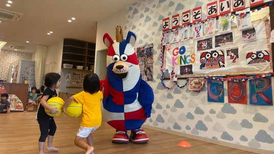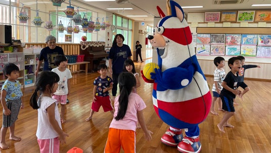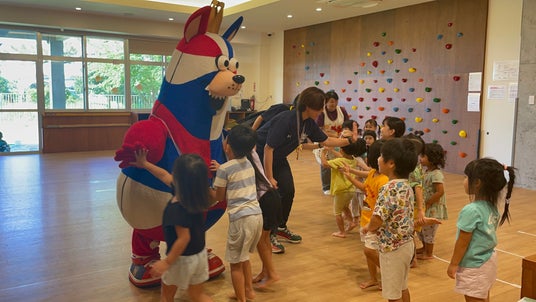 めばえ保育園とあいあい保育園南城園では、ゴーディーが子どもたちとボール遊びを行い交流しました。バランス力を鍛えるストレッチや、交流会全員参加のボールパス回しなどで楽しく身体を動かしました。