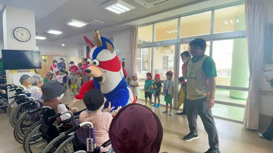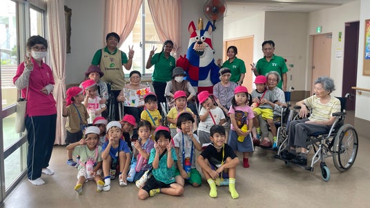 特別養護老人ホーム森城では、パーチェ山里保育園・パーチェ山里認可保育園の子どもたちと一緒に敬老会に参加し、ゴーディーに関する◯×クイズや写真撮影でふれあいを深めました。