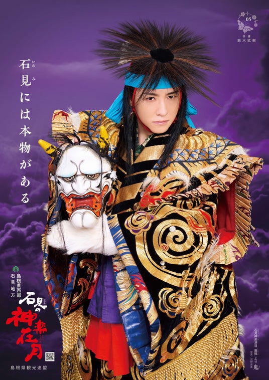 石見神楽国立劇場公演(令和4年7月)に演目紹介として、石見神楽東京公演(令和5年12月)に語りべとして出演され、舞台や、ドラマ、映画、ミュージカルなど、既存の枠にとらわれない演技が魅力の俳優・鈴木拡樹さんとタイアップ。鈴木さんが石見神楽の衣裳を着用したPRポスターとカード(2種類)を制作しました。