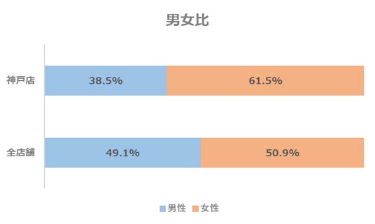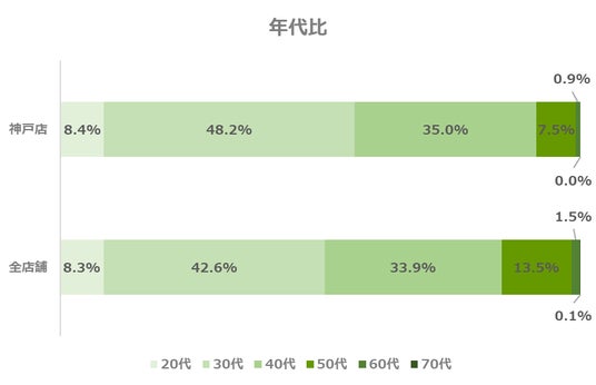 神戸店の年代別構成比は、全店舗と比べて30代、40代の割合がやや高い傾向にあり、8割を超えています。