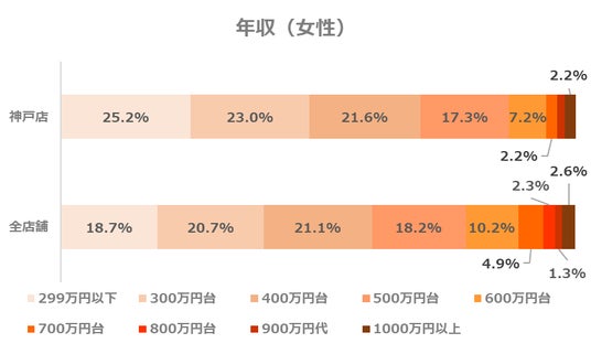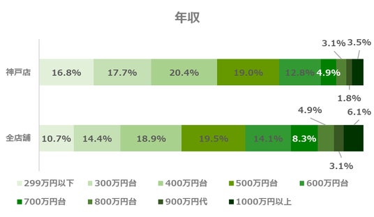 神戸店では、全店舗と比較して年収400万円台の方の割合が高く、ついで500万円台の方が多い結果となっています。