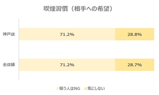 ただし、パートナーエージェント全体の会員様と比較すると、神戸店は喫煙している方の割合がやや高い傾向にあります。