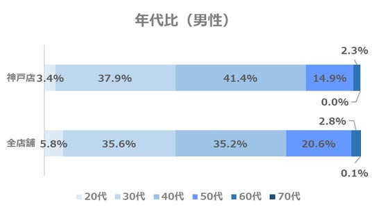 一方で、男性は30代よりも40代の割合が高く、全店舗を上回っています。