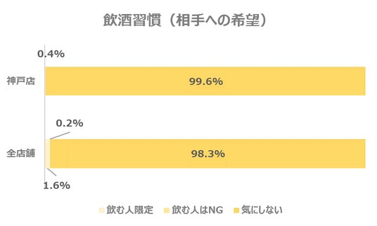 こちらもお相手に求める飲酒の習慣についてのデータを見てみると、神戸店の会員様の99.6%が「気にしない」と回答し、全店舗よりもやや多い結果となりました。