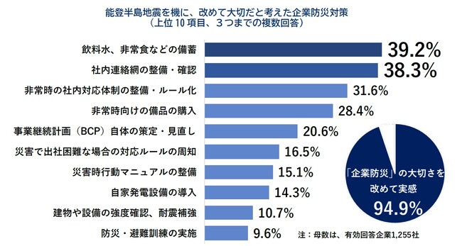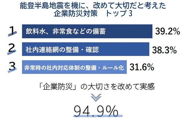 企業の94.9%が今回の地震を機に「企業防災」の大切さを改めて実感。なかでも「飲食料備蓄」「連絡網の整備」が4割近くで上位。「BCP策定・見直し」は5社に1社
