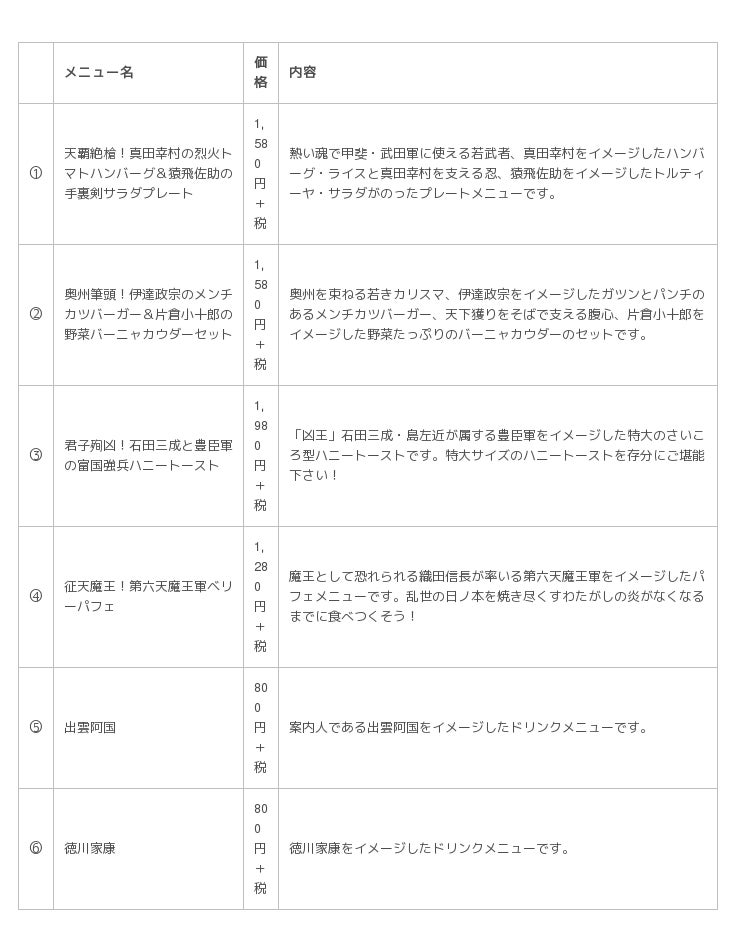 また、7月19日(金)~8月21日(水)にて、キュープラザ池袋内カプコンカフェ池袋店で展開する『戦国BASARA バトルパーティー』コラボレーションにつきまして、限定メニューを公開します。