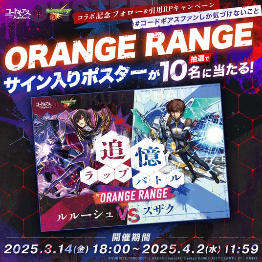 さらに、映像内には「コードギアス 反逆のルルーシュ」の各話のタイトルが5個隠されており、ひとつでも見つけられた方から抽選で「ORANGE RANGEサイン入りポスター」が当たるフォロー&引用RPキャンペーンをXにて実施します。